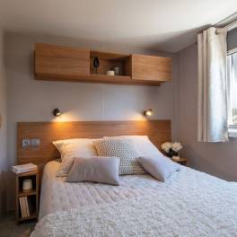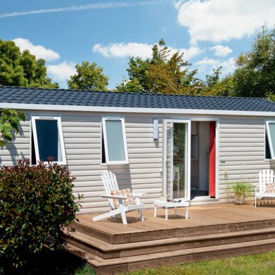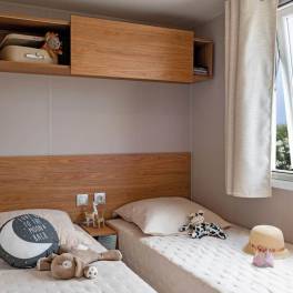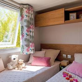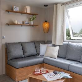 De Azurée Chalet is perfect voor gezinnen of vriendengroepen die op zoek zijn naar ruimte, comfort en gezelligheid. Deze ruime chalet van 8,95 x 4,2 meter beschikt over drie slaapkamers – één met een dubbel bed en twee met elk twee aparte eenpersoonsbedden – en een lichte, ruime leefruimte met een uitschuifbare tafel voor 4 tot 6 personen.
