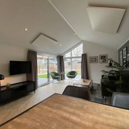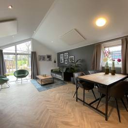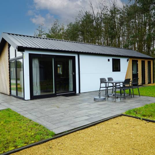 Comfort van binnen en buiten, daar staat deze 4-persoons vakantiewoning voor. De mooie locatie met uitzicht over de tuin bindt de ogen elke dag weer op prettige wijze, daarnaast is de woning zelf ook onderscheidend. Zowel van binnen als buiten zijn onderhoudsvriendelijke materialen gebruikt, verder is ze volledig geïsoleerd en voorzien van dubbele beglazing. De grote ramen verschaffen u elke dag weer een mooie aanblik over het ‘groen’ wat het gevoel van rust en ruimte, waar een vakantie veelal voor staat, versterkt. Datzelfde doet ook het terras aan de voorzijde van de vakantiewoning.Het gevoel van rust en ruimte is ook van toepassing wanneer u de woning binnengaat. U komt direct in de grote living met open keuken die bestaat uit een keukenblok en alle benodigde keukenaccessoires. Dit laatste houdt in dat u beschikt over een kookplaat, afzuigkap, koel-vriescombinatie, vaatwasser, magnetron, oven en een kraan met daaronder een rvs spoelbak.Vanuit de living heeft u direct toegang tot de gang waar de twee slaapkamers en de badkamer zijn gelegen. Voor beide geldt dat, net als bij de living en de keuken, ze compleet met mooie materialen worden ingericht.
