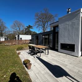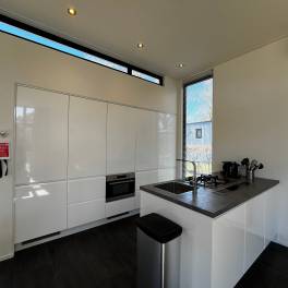 De open living voelt ruim en licht aan door de grote raampartijen, die zorgen voor een prachtig uitzicht over de tuin. Hier vindt u een sfeervolle loungehoek met comfortabele zitbanken, een eethoek, airconditioning en een moderne open keuken. De keuken is volledig uitgerust met hoogwaardige inbouwapparatuur, waaronder een koel-vriescombinatie, combimagnetron, oven, vaatwasser en een kookplaat met afzuigkap.