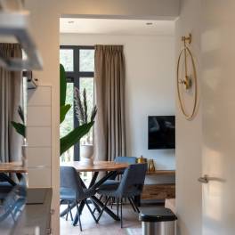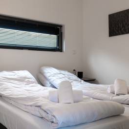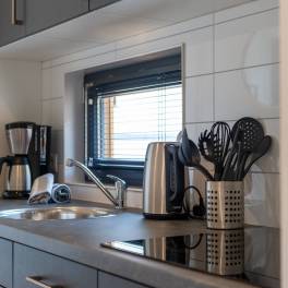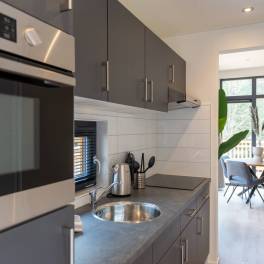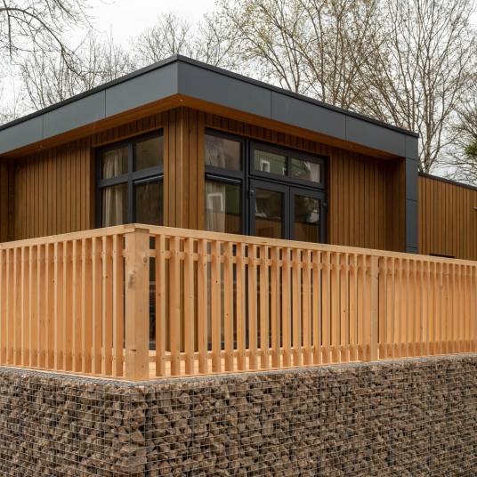Een robuust aanzien met een warm en toch ruimtelijke uitstraling, dat is de Cube la Mer in een notendop. Deze gelijkvloerse 4-persoons recreatiewoning is gebouwd op een verhoging dat op architectonisch fraaie wijze is ingekleurd met Ardenner breukstenen, passend bij de omgeving. Dat is het voornaamste robuuste attribuut aan dit type woning, het ruimtelijke aspect wordt gesymboliseerd door ten eerste de grootse veranda die door haar omvang ook veel weg heeft van een balustrade. Vanaf daar en vanuit de living, die wordt omlijst door grote raampartijen, heeft u een mooi uitzicht op de heuvelachtige omgeving. De openslaande deuren naar het terras zorgen voor bovendien voor nog meer vakantiebelevenis.Tegelijkertijd is er ook een andere binding met de omgeving: de houtlook van dit chalet past namelijk naadloos bij de bosrijke regio. Van binnen straalt de Cube la Mer het gevoel van thuis uit. De living is warm aangekleed met een ronde eettafel, comfortabele stoelen, een tv-meubel en de loungebank en staat bovendien in directe verbinding met de keuken voor nog meer gezinsbeleving. De kookruimte is bovendien van alle gemakken voorzien met een kookplaat, afzuiging, kraan met rvs spoelbak, koel-vriescombinatie, magnetron en vaatwasser.Deze recreatiewoning heeft twee slaapkamers, een met een tweepersoonsbed en een met twee eenpersoonsbedden met een nachtkastje ertussen. Beide slaapkamers beschikken, buiten de nachtkastjes om, over genoeg opbergruimte. De badkamer is volledig betegeld en is verder ingericht met een douchecabine, wastafel met spiegel, toilet en designradiator.