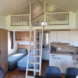 In Tiny House 4 verblijft u kleinschalig in een knus chalet met een warme inrichting van natuurlijke materialen. Het chalet heeft een speelse indeling van meerdere kleine verdiepingen en is geschikt voor maximaal 4 personen. Op de begane grond bevindt zich de woonkamer met een gezellige zithoek met televisie en pelletkachel, een eethoek en een keuken met voorzieningen als een koelkast, gasstel en koffiezetapparaat. In totaal zijn er 2 slaapruimtes, waarvan één op de begane grond die in directe verbinding met de woonkamer staat. De andere slaapruimte is te bereiken via een trap. Verder is er een badkamer met een douche, wastafel en toilet. Buiten beschikt u over een eigen gemeubileerd terras. U kunt nabij het chalet uw auto parkeren en u kunt gratis verbinding maken met de Wi-Fi.
