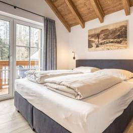 The three bedrooms on the upper floor impress with high ceilings while exuding a cozy alpine charm. Two of the bedrooms are furnished with double beds, one of which has its own en-suite bathroom. The third bedroom contains two bunk beds. The chalet can accommodate up to eight guests comfortably.
