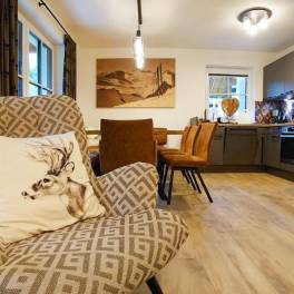 Guests enter the chalet through the entrance area, which leads directly to the practical ski and utility room—perfect for storing equipment after a wonderful day in the snow. Afterwards, everyone can cook, dine, and relax together in the spacious, bright, and modern open-plan living and dining area with a fully equipped kitchen. The ground-floor bathroom, featuring a built-in sauna, promises wellness and relaxation.