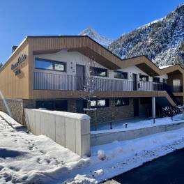 De open woon/eetkamer maakt indruk met een hoogwaardige merkkeuken en directe toegang tot het ruime terras met tuin – perfect voor gezellige avonden of ontspannende uren in de natuur. Grote ramen laten veel natuurlijk licht binnen en bieden een ongeëvenaard uitzicht op het schilderachtige berglandschap.