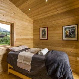 De bovenverdieping is bereikbaar via een buitentrap en bestaat uit een hal met garderobe, een badkamer en toilet, een prachtige open leefruimte met keuken, wonen en eten in één ruimtelijk geheel, evenals een gezellige slaapkamer. Het interieur straalt een verfijnde, sobere alpine sfeer uit warm, uitnodigend en rijk aan hout. Een woning van echte kwaliteit en waarde.