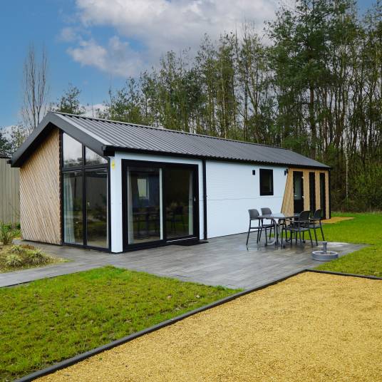 Comfort van binnen en buiten, daar staat deze 4-persoons vakantiewoning voor. De mooie locatie met uitzicht over de tuin bindt de ogen elke dag weer op prettige wijze, daarnaast is de woning zelf ook onderscheidend. Zowel van binnen als buiten zijn onderhoudsvriendelijke materialen gebruikt, verder is ze volledig geïsoleerd en voorzien van dubbele beglazing. De grote ramen verschaffen u elke dag weer een mooie aanblik over het ‘groen’ wat het gevoel van rust en ruimte, waar een vakantie veelal voor staat, versterkt. Datzelfde doet ook het terras aan de voorzijde van de vakantiewoning.Het gevoel van rust en ruimte is ook van toepassing wanneer u de woning binnengaat. U komt direct in de grote living met open keuken die bestaat uit een keukenblok en alle benodigde keukenaccessoires. Dit laatste houdt in dat u beschikt over een kookplaat, afzuigkap, koel-vriescombinatie, vaatwasser, magnetron, oven en een kraan met daaronder een rvs spoelbak.Vanuit de living heeft u direct toegang tot de gang waar de twee slaapkamers en de badkamer zijn gelegen. Voor beide geldt dat, net als bij de living en de keuken, ze compleet met mooie materialen worden ingericht.