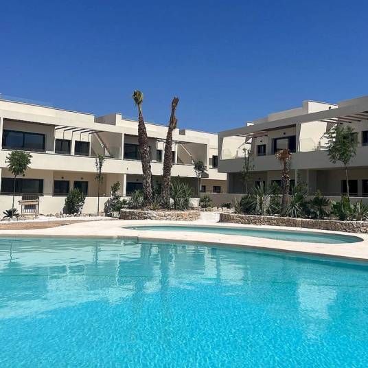 Maisonnettes met 2 slaapkamers en 2 badkamers in een gesloten en beveiligde residentie met een grote mediterrane tuin met verschillende zwembaden, wellness-en fitnessruimtes in een exclusieve wijk van Torrevieja.