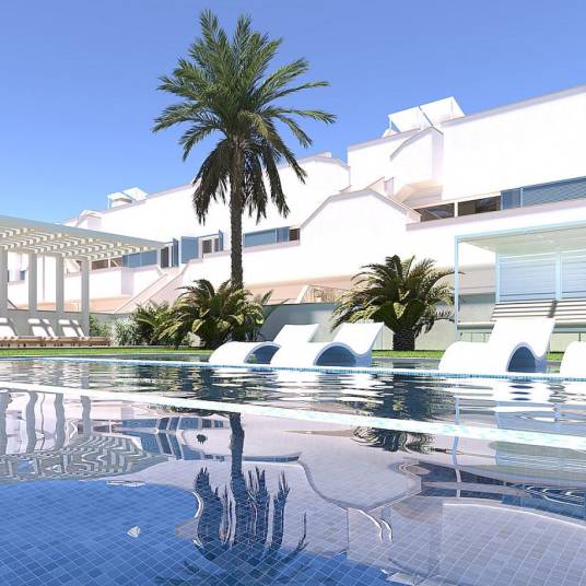 Nieuwbouwresort met maisonnettes met drie slaapkamers en twee badkamers en ook twee vrijstaande herenhuizen en een vrijstaande villa, gelegen op een paar meter van de mooie stranden in Torre de la Horadada.