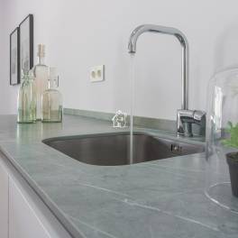 De moderne keuken is voorzien van greeploze kasten en een werkblad van Neolith of vergelijkbaar materiaal.