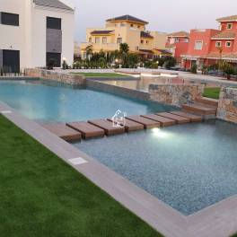 Er zijn vier gemeenschappelijke zwembaden met verwarmde jacuzzi’s en rustruimtes met kunstgras.