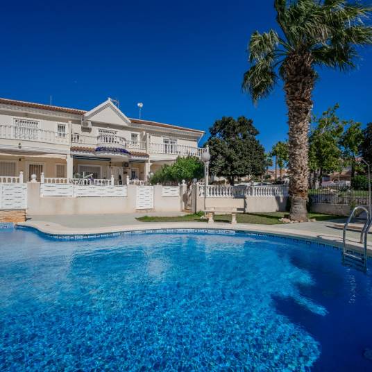 Positioned at the end of the row, the home enjoys a generous front garden—a rare feature—opening directly onto beautiful views of the communal pool, perfect for relaxed mornings or sunset evenings outdoors.
