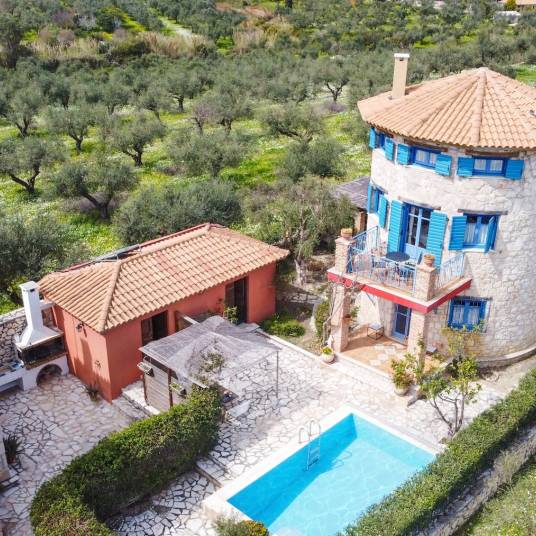 Een complex van twee prachtige, onafhankelijke stenen villa’s, de Tower en het Country House, in landelijke stijl op een gedeeld perceel van 600 m². De woningen zijn volledig gebouwd van lokale steen en hout, wat een warm en ‘huiselijk’ gevoel geeft, en elk woning heeft een eigen zwembad. Deze woningen zijn gebouwd in 2007 en liggen in Vasilikos, waarschijnlijk het mooiste deel van Zakynthos, en zijn perfect als u huurinkomsten wilt genereren.De TorenThe Tower is een echte blikvanger: een 120 m² torenhuis gebouwd op drie niveaus. Op de begane grond is er een open, gezellige woonkamer met een aangrenzende en volledig uitgeruste keuken. Op de eerste verdieping is er een slaapkamer met een tweepersoonsbed, een en-suite badkamer en een eigen balkon met een prachtig uitzicht op de zee en de heuvel van Vasilikos.Op de tweede verdieping is er een slaapkamer met twee eenpersoonsbedden en een en-suite badkamer. Er zijn kleine ramen rondom de kamer, die een 360-graden uitzicht op de heuvels en de zee geven.Buiten is er een patio voor de ingang, en het voorste gedeelte is bedekt met stenen. Er is een kleine tuin rond het huis en een ‘geheime hoek’ voor ontspanning. Aan de achterkant van het huis is er een barbecue.Het zwembad is 5x3m (L-B).Het huis is volledig uitgerust voor de winter, want er is een verwarmingssysteem rondom, evenals twee openhaarden; een op de begane grond en een op de 1e verdieping in de slaapkamer.Het landhuisHet Country House is een woning van 100 m², gebouwd over twee verdiepingen. Op de begane grond is er een open, gezellige woonkamer met aangrenzend een volledig uitgeruste keuken (op gas). Op de eerste verdieping zijn er twee slaapkamers met tweepersoonsbedden, een gedeelde badkamer, en een balkon met een geweldig uitzicht op zee.Buiten is er aan de voorkant een grote patio en het hele gebied is bedekt met steen. Aan de zijkant van het huis is er een barbecue en een houtgestookte oven.Het zwembad is 4 x 2.5m (L-B).Het huis is volledig uitgerust voor de winter, want er is een verwarmingssysteem rondom, evenals twee open haarden, een op de begane grond en een op de 1e verdieping in de slaapkamer.De opslagruimteEr is een gebouw van 28 m² dat momenteel is verdeeld in twee aparte ruimtes. Een ruimte wordt gebruikt als opslag en de andere ruimte herbergt de sauna samen met een badkamer. Dit gebouw kan worden omgebouwd tot een klein huis, waardoor extra woonruimte wordt gecreëerd.VerhuurVanaf 2022 worden de eigendommen gebruikt als een verhuurbedrijf met een uitstekende bezettingsgraad, vooral gezien het feit dat het hun eerste jaar is. Van begin tot eind worden de boekingen rechtstreeks beheerd door een professioneel bedrijf en het operationele gedeelte (schoonmaak, onderhoud, enz.) wordt uitbesteed aan een zeer betrouwbare derde partij. Eigenaren worden volledig op de hoogte gehouden van managementbeslissingen en opties bij elke stap van het proces, zodat ze de waarde van hun investering probleemloos kunnen maximaliseren.De nieuwe eigenaar verwerft een opgezet en lopend bedrijf met zeer goede vooruitzichten. Een toegevoegde waarde, aangezien het verblijf zichzelf kan terugverdienen, zodat de eigenaren het hele jaar door kunnen genieten van de ultieme vakantiebestemming, wanneer zij maar willen en zolang zij maar willen.De locatieVasilikos is waarschijnlijk het mooiste gebied van het eiland. Gelegen op het zuidoostelijke deel van het eiland, een landschap vol dennenbossen, olijfgaarden, bergen, en wilde dieren.Het platteland gaat gepaard met lange zandstranden, waaronder het strand van Gerakas, waar het Nationaal Marine Park van Zakynthos zich bevindt en wat ook het belangrijkste broedstrand voor de zeeschildpad Caretta Caretta is.De woningen liggen op slechts 2 minuten lopen van het dorp Vasilikos, dat klein en rustig is. Er zijn slechts een paar kleine hotels en verhuurde kamers. Er is een verscheidenheid aan leuke restaurants, taverna’s en coffeeshops/bars in de buurt en veel van die zijn op loopafstand van de woningen.