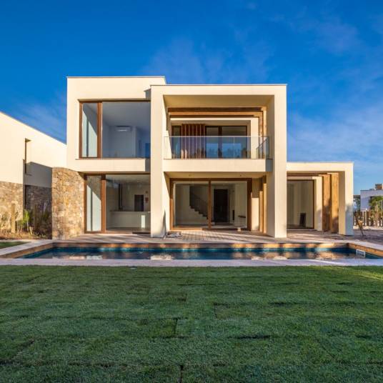 Elke villa beschikt over een eigen aangelegde tuin met zwembad, een elektrisch bedienbare veranda en een beveiligde privéparkeerplaats voor een auto. Deze woningen zijn ontworpen om in harmonie te zijn met de natuurlijke schoonheid van de omgeving. Ze bieden leefruimtes die de grenzen tussen binnencomfort en buitenpracht doen vervagen door intensief gebruik van glas en materialen die moeiteloos van binnen naar buiten worden gekoeld.