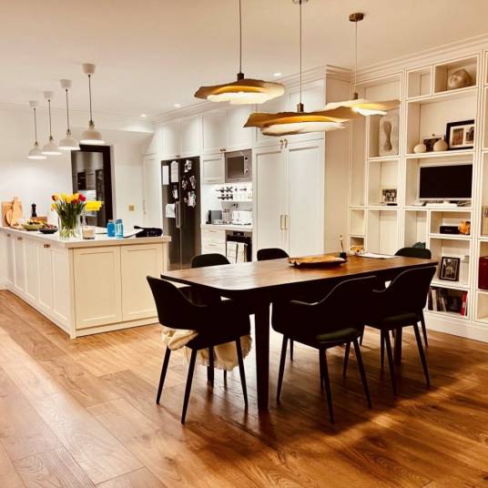 De eerste woning heeft op de begane grond een woonkamer met eethoek en keuken. Er is een lichtrijke inkomhal en gastentoilet. Daarnaast heb je directe toegang tot de buitenruimte met buitenkeuken, een aparte wasruimte, bergruimte en een privé terras. Op de eerste verdieping is er een ruime slaapkamer met walk-in-closet, een kleinere slaapkamer met toegang tot een terras en een badkamer met douche en bad. De derde verdieping bestaat uit een grote ruimte die als bureel of ontspanningsruimte dienst kan doen, een slaapkamer en een badkamer met douche.