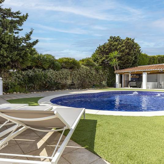 Outside, the villa truly shines with its private swimming pool, outdoor bar, and summer kitchen—creating a wonderful setting for gatherings or simply unwinding under the Mediterranean sun. The terrace area also includes an external shower and toilet, while the large lower garden offers even more space for lounging or personal landscaping projects.