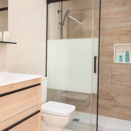 Deze gelijkvloerse woningen bestaan uit drie tweepersoonsslaapkamers (allemaal met inbouwkasten), twee badkamers (waarvan één en-suite), een volledig ingerichte moderne keuken en een open woon-/eetkamer die uitkomt op de privétuin met zwembad. Een trap leidt naar een groot privédakterras met prachtig uitzicht. Er is parkeergelegenheid op het perceel.