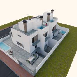 Dit zijn 4 halfvrijstaande villa’s, verdeeld over 2 verdiepingen plus kelder en solarium. De begane grond bestaat uit een woon-eetkamer met open keuken, 1 complete badkamer en 1 slaapkamer met inbouwkast. De eerste verdieping bestaat uit een slaapkamer met dressing, 1 slaapkamer ook met inbouwkast en 1 complete badkamer. Beide slaapkamers hebben een eigen balkon. De bovenste verdieping is het solarium met uitzicht op zee. De kelder is volledig open, heeft 1 wasruimte en toegang vanuit het huis. Wat betreft het exterieur heeft elk perceel een terras, parkeerplaats en 1 Engelse patio die van buitenaf toegang geeft tot de kelder. Huizen A en D hebben ook hun eigen zwembad op het perceel, terwijl huizen B en C hun eigen jacuzzi op het solarium hebben. Extra functies zijn onder andere: ingerichte keuken (ZONDER elektrische apparaten), porcellanato vloeren, wit gelakt interieur timmerwerk, PVC exterieur timmerwerk met Climalit glas, gemotoriseerde rolluiken en pre-installatie van airconditioning.