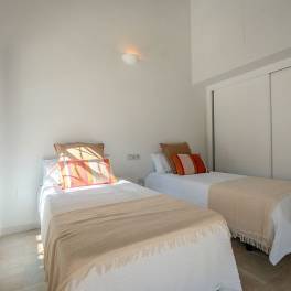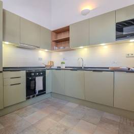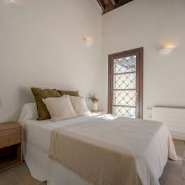 Bestaande uit twee slaapkamers, twee badkamers, een keuken met wasruimte en een uitgebreide eetkamer/salon met twee enorme openslaande deuren die de woning een buitengewone lichtinval geven, onder het indrukwekkende houten balkenplafond.