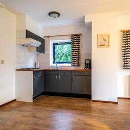 Stap je door de voordeur kom je in een hal. Recht van je is een berging met de Cv-installatie. Links vind je het toilet met fontein en daarnaast de trapopgang naar de eerste verdieping. Rechtdoor kom je in de keuken. Deze is voorzien van een 4-pits gasfornuis, afzuigkap en een koelkast.