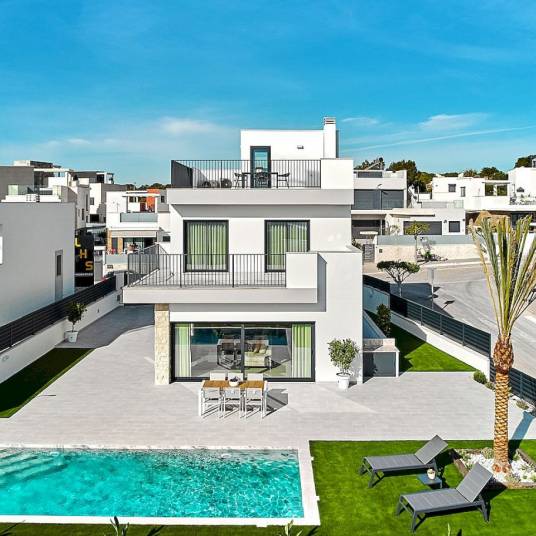 Deze moderne woningen bieden 3 slaapkamers, 3 badkamers, een ruime woon-eetkamer en een volledig uitgeruste keuken, evenals een tuin en zwembad.