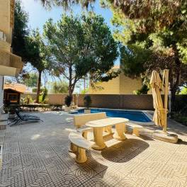 Ook de buitenruimte is indrukwekkend, met een privézwembad omgeven door weelderig groen en een goed onderhouden tuin. Een groot terras biedt extra ruimte om buiten te dineren of te ontspannen in de zon.