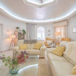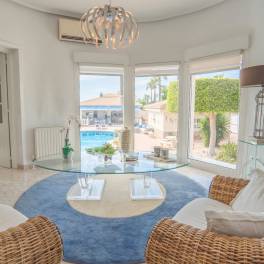 Ontspannende en uitnodigende woonruimtes: De buitenlounge van de villa, met comfortabele zitplaatsen, is de ideale plek om te ontspannen of gasten te ontvangen terwijl u geniet van het uitzicht op het privézwembad en de verzorgde tuin.