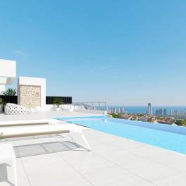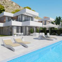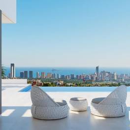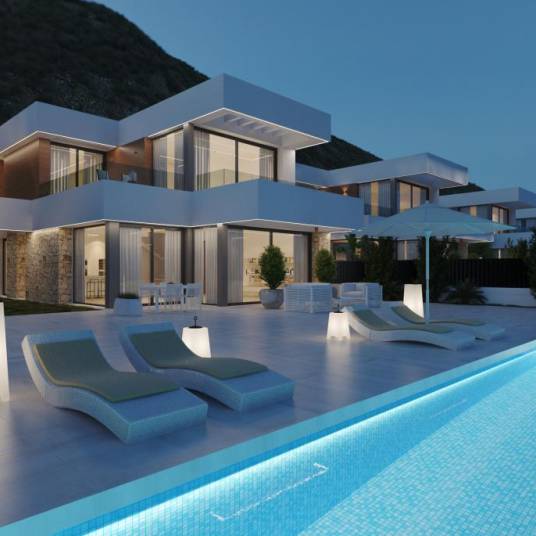 Spectaculaire luxe villa’s gelegen de bergwand in de prestigieuze regio Sierra Cortina met panoramisch zicht op zee.Deze ultra moderne villa’s zijn gelegen op zeer korte afstand van alle faciliteiten zoals winkels, shoppingcentra, supermarkten, restaurants, golf en uiteraard ook het strand. Ze zijn strategisch gelegen tussen Finestrat en Benidorm, waardoor dit een échte toplocatie is. Men kan zowel genieten van het authentieke Spanje in Finestrat als van het meer toeristische Benidorm. Bovendien geniet men in deze wijk van 24u – 7/7 bewaking.De villa’s worden afgewerkt met zeer hoogwaardige materialen en beschikken over drie slaapkamers en vier badkamers, een open keuken met kookeiland dat aansluit op de enorme woonkamer, verschillende terrassen op eerste verdieping met panoramisch zicht op zee. Bovendien beschikt deze villa over een gigantische onderbouw en een grote ondergrondse garage van waaruit men de lift naar de gelijkvloerse verdieping kan nemen. Het woongedeelte van deze villa is gelegen op twee niveaus boven straatniveau, hierdoor geniet van totale privacy!De villa’s beschikken over een domotica systeem, dat de airco, verwarming, alarm, elektrische rolluiken, verlichting etc. aanstuurt.De ruime aangelegde tuin beschikt over een enorm overloop zwembad van waaruit men geniet van het adembenemende zicht op zee en de skyline van Benidorm.