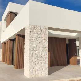 Deze prachtige villa met natuurstenen afwerking heeft 2 verdiepingen die met elkaar verbonden zijn via een moderne interne trap. De begane grond heeft twee slaapkamers met en-suite badkamers, een keuken, een woon-eetkamer, een bijkeuken en een toilet. De keuken is volledig uitgerust en staat in open verbinding met de woonkamer. De glazen schuifdeuren geven direct toegang tot een groot terras en het zwembad. De bovenverdieping heeft nog een slaapkamer met een badkamer.