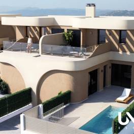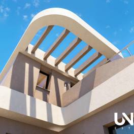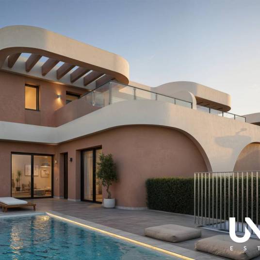 Op slechts een kwartiertje rijden van de stranden van Guardamar, vind je een nieuwbouwproject dat zich radicaal onderscheidt van de standaard Spaanse villabouw. Geen hoekige blokken of repetitieve ontwerpen, maar een organische architectuur met zachte, vloeiende lijnen die direct de aandacht grijpt. Hier verrijzen 12 unieke halfopen villa’s met een uitgesproken identiteit.Binnen is gekozen voor een serene, moderne afwerking in neutrale tinten. De open keuken met Silestone werkblad sluit naadloos aan op de lichte woon- en eetruimte, waar grote ramen het binnenleven verbinden met het buitenleven. Dankzij de doorlopende vloerafwerking tussen binnen en buiten voelt en is het terras als een verlengstuk van je woonkamer.Elke villa telt 3 slaapkamers en 2 badkamers op een perceel van circa 195 tot 218 m². De masterbedroom met en-suite badkamer bevindt zich op de begane grond, wat zorgt voor extra comfort en toegankelijkheid. Boven vind je nog 2 ruime slaapkamers en een 2de badkamer, perfect voor gasten of gezinsleden.Buiten wacht je een verzorgde tuin met mediterrane uitstraling, optioneel aangevuld met een privézwembad van 15 m². Een intiem zonneterras, volledig omheind voor maximale privacy, vormt het ideale decor voor ontspannen momenten of zomerse diners. Bovenop is een royaal dakterras voorzien — een zonnige uitkijkplek met zicht op het groene binnenland en de berglijnen in de verte.Praktisch is ook aan alles gedacht: elektrische rolluiken in de slaapkamers, pre-installatie voor airconditioning, LED-verlichting, zonnepanelen en privéparkeergelegenheid op het perceel. De ligging in een rustige wijk van Daya Nueva garandeert rust, maar biedt tegelijk directe toegang tot lokale winkels, restaurants en sportvoorzieningen — allemaal te voet bereikbaar.Geef ons gerust een seintje voor meer info!