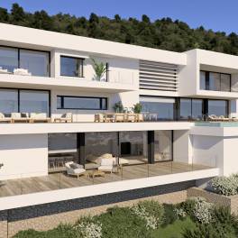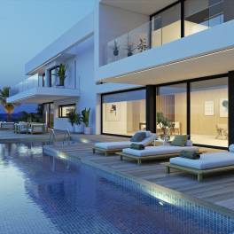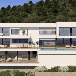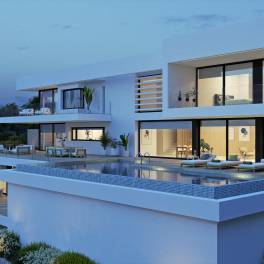 Villa Marblau staat op een bevoorrechte plaats binnen het residentiële complex van Jazmines, per definitie luxe en privacy. Een architecturaal moderne bouw met duidelijke lijnen en edele materialen, een ervaring waarbij design overloopt in het mediterrane landschap en zorgt voor een gedistingeerde en serene manier van leven. De ingang tot de woning is op de bovenverdieping, waar er buiten ook een grote overdekte parkeerplaats is en een gesloten garage met plaats voor verschillende auto's. Op deze verdieping komt u via de hall in de zitruimtes en de rest van de woning is te bereiken met de lift en de trap, wat zorgt voor een gemakkelijke en functionele doorgang tussen alle niveaus. Er zijn drie verdiepingen in de woning met in totaal 5 slaapkamers en 9 badkamers. Op de hoofdverdieping zijn een ruim salon en eetkamer met een open design keuken met kookeiland, afgewerkt met notenhout en antraciet. Op dit niveau bevindt zich ook de hoofdsuite met dressing, eigen badkamer en rechtstreekse toegang tot het terras. Op de bovenverdieping zijn er drie slaapkamers met en-suite badkamer en privé terrassen, voor het comfort van de gasten. De benedenverdieping is voorzien voor vrije tijd en relax, met een bioscoop en surround sound- systeem, fitnessruimte, overdekt zwembad, sauna en hammam. Er is ook nog een appartement voor gasten, uitgerust met een keuken, salon en slaapkamer met privé badkamer. Villa Marblau is uitgerust met een volledige installatie van de hoogste rang, zoals ventilatie via leidingen met Mitsubishi Electric® technologie, vloerverwarming met Ecodam hybride systeem, domotica voor de controle over de installaties, buitenschrijnwerk met thermische isolatie en zonwerend glas, huishoudapparatuur van merken zoals Miele en Siemens en technische design verlichting van FLOS en Arkoslight. Elke badkamer is een toonbeeld van eigentijdse elegantie, met hangtoiletten, opbouwwastafels, inbouwkranen en grootformaat wandbekleding in warme en verfijnde tinten.Het terras geeft uitzicht op een permanent spektakel: de zee, de Peñón de Ifach en de kust zijn als een levend kunstwerk voor onze ogen. Het lijkt alsof de infinity pool versmelt met de blauwe lucht. Een uitnodiging tot rust en genot van het essentiële.