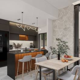 De begane grond beschikt over een open woon-eetkamer met een volledig geïntegreerde keuken en directe toegang tot de tuin en het privézwembad. Op deze verdieping bevindt zich ook een slaapkamer, een complete badkamer en een handige bijkeuken.