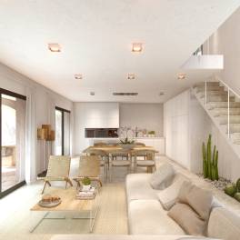 Begane grond: open ruimte van 67 m² met woonkamer, eetkamer en volledig uitgeruste keuken met eiland, spoelbak en afzuigkap. Toegang tot 26 m² overdekt terras, hoofdslaapkamer met ensuite badkamer, gastentoilet en bijkeuken.
