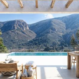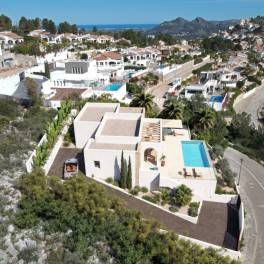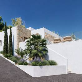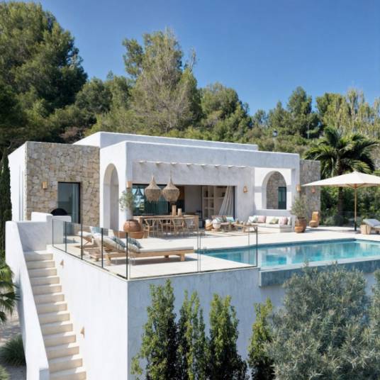 Ibizastijl villa in de Urbanisatie Solana II, met panoramisch uitzicht op de bergen en een zuidelijke oriëntatie.