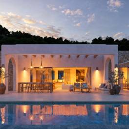 De villa, ontworpen met een moderne en functionele indeling, heeft drie ruime slaapkamers en twee badkamers. De master bedroom heeft directe toegang tot het terras en het zwembad, evenals een ensuite badkamer. De wooneetkamer wordt gekarakteriseerd door zijn ruimtelijkheid en licht, dankzij grote ramen die direct toegang geven tot het overdekte terras met een houten pergola. De volledig uitgeruste open keuken heeft toegang tot een bijkeuken en het barbecuegedeelte op het terras.