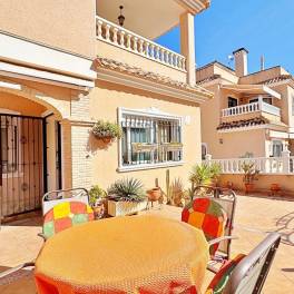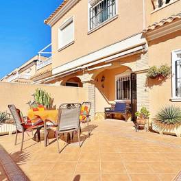 Beautiful corner quad-style duplex located in the exclusive Vista Azul Residential, one of the most desirable developments in Villamartin, Orihuela Costa. This home perfectly combines Mediterranean style, comfort and an excellent location within a quiet, family-friendly environment close to all essential amenities.~~With 90 m2 of built area on a 120 m2 plot, the property enjoys a southwest orientation, providing plenty of natural light all day long. The ground floor offers a bright living-dining room with direct access to the terrace, a fully equipped independent kitchen, one bedroom ideal for guests or a home office, and a complete bathroom. The upper floor features two bedrooms with fitted wardrobes, a second bathroom, and access to a 20 m2 private solarium, perfect for sunbathing, relaxing or enjoying open views.~~The property is in excellent condition and equipped with air conditioning, awnings, security door and private parking inside the plot. The spacious terrace surrounding the house provides several outdoor dining and chill-out areas, ideal to enjoy the Mediterranean climate all year round.~~The Vista Azul complex offers exceptional communal facilities including two swimming pools (one covered), jacuzzi, sauna and gym, making it one of the most complete and sought-after communities in Villamartin.~~Located next to Villamartin Golf Course, close to La Zenia Boulevard and Playa Flamenca, and only 3 km from the beaches of Orihuela Costa, this home is perfect for those looking to buy a duplex in Villamartin or invest in a property for sale on the Costa Blanca.~~A charming property, ready to move into — ideal as a permanent home, a holiday residence or a real estate investment in Orihuela Costa.