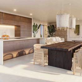 De villa’s beschikken over een ruime open woonruimte met grote schuifpuien die direct toegang geven tot de privétuin met zwembad. De moderne keuken is volledig uitgerust met inbouwapparatuur en sluit aan op de eetruimte. Op deze verdieping bevindt zich tevens de master bedroom met en-suite badkamer en dressing, evenals een extra gastentoilet.