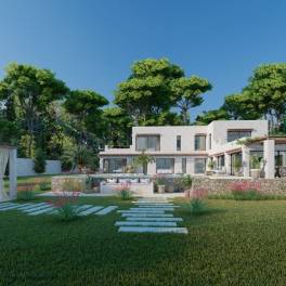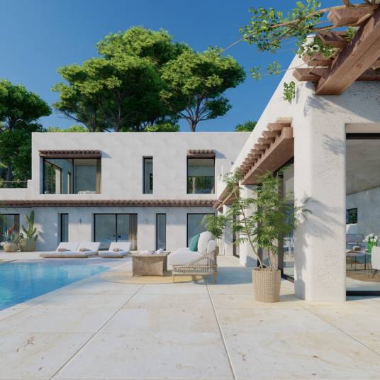 Deze nieuwbouwvilla in Ibiza-stijl beschikt over vier ruime slaapkamers, elk met een eigen en-suite badkamer voor optimale privacy. De open keuken en ruime woonkamer vormen samen een lichte en uitnodigende leefruimte, met directe toegang tot het terras, de tuin en het elegante zwembad.