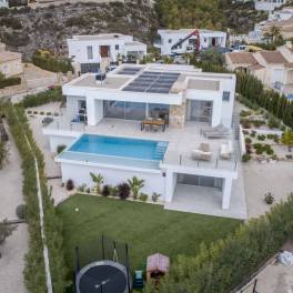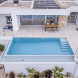Deze prachtige villa in moderne stijl staat op een perceel van 800 m2 en heeft een perfecte oriëntatie om het hele jaar door van de zon te genieten.Vanaf de straat hebben we toegang tot het huis via een voetgangerspoort én een automatische poort en een parkeerplaats voor minstens 2 auto’s. Vanaf hier voelen we al de schoonheid van de Mediterrane tuin die de villa omringt.Bij binnenkomst in de villa vinden we een hal die toegang geeft tot de 3 tweepersoonsslaapkamers die we op deze verdieping hebben, een van hen, de master suite met en-suite badkamer en prachtig uitzicht op zee en uitgang naar het zonneterras en het zwembad.De prachtige open keuken is volledig uitgerust met alle apparatuur en klaar om van te genieten. Vanuit de keuken heb je prachtig uitzicht op zee. Keukeneiland met ontbijtbar.Mooie en ruime zit- en eetkamer waar je kunt genieten van het adembenemende uitzicht op zee.Vanuit de woonkamer hebben we grote ramen die we kunnen openen en de woonkamer en eetkamer samenvoegen met het buitenterras om te genieten van de mediterrane levensstijl.Er is een groot terras met privé overloopzwembad.Verderop vinden we een apart gastenappartement met toegang van buitenaf. Het gastenverblijf heeft 1 grote slaapkamer en een badkamer en suite. Vanuit deze flat hebben we toegang tot een privéterras en de prachtige tuin.Een prachtige mediterrane tuin geeft je het gevoel in een paradijs te wonen!Extra’s: vloerverwarming, gekanaliseerde airconditioning, ledverlichting, overloopzwembad, automatisch irrigatiesysteem, grote berging, perfecte oriëntatie op de zon, verwarmd zwembad, 22 zonnepanelen en toeristenvergunning.Nieuwsgierig geworden, vragen of een bezichtiging plannen? Neem vrijblijvend contact met ons op!