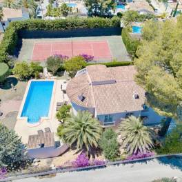 Villa met uitzicht op zee in Pla del Mar van 362 m2 bebouwd op een perceel van 880 m2, zwembad, garage en (optioneel) tennisbaan.Absolute opportuniteit om te investeren in het gewilde Moraira, in de meest gezochte wijk.2 verdiepingen met in totaal 5 slaapkamers en 3 badkamers, woonkamer, keuken, berging, garage.De eerste verdieping is het primaire woonvertrek met 3 slaapkamers, 2 badkamers, living en volledig uitgeruste ruime keuken.Alle vertrekken in deze woning zijn van een mooi ruim formaat, geen ‘hokjes’.Deze verdieping heeft ook een overdekt terras over de gehele breedte, van waaruit u kunt genieten van een panoramisch uitzicht op zee richting Calpe en een weids uitzicht naar het westen. Toegang tot dakterras.Oriëntatie zuidwesten, volop zon met een panoramisch zicht op de zonsondergang.De begane grond is ingericht met 2 slaapkamers en een zeer ruim, nader in te vullen oppervlak, uitstekend te benutten als living met keuken.Gesitueerd aan een cul-de-sac, op slechts 1km van het centrum en het strand van Moraira, in de populaire urbanisatie Pla del Mar. Gemakkelijke wandeling naar het dorp Moraira, de jachthaven en strand.Het object bestaat uit twee aangrenzende percelen. Het voorste perceel, waar momenteel een tennisbaan op ligt, kan optioneel worden mee aangekocht. Vlak perceel met zwembad op het zuiden. Zonnig terras en volgroeide mediterraanse tuin met buitenkeuken. Garage en toegangspoort (elektrisch)In goede staat, inclusief recente schilderbeurt.