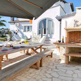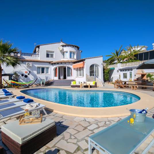 Gelegen in het prachtige Moraira, onder de gemeente Teulada, bevindt zich deze indrukwekkende villa. Met een bebouwde oppervlakte van 233 m² op een ruim perceel van 809 m², biedt deze villa een luxe leefomgeving met alle voorzieningen die u nodig heeft voor een comfortabel verblijf aan de Costa Blanca.Villa met Zeezicht en PrivézwembadDeze villa is ideaal gelegen op minder dan 3 kilometer van zowel het strand als het centrum van Moraira. Een perfecte locatie voor diegenen die op zoek zijn naar rust, privacy en toch de nabijheid van alle faciliteiten en recreatiemogelijkheden. Het uitzicht op zee vanaf de villa is adembenemend, en het privézwembad maakt het buitenleven compleet, waar u kunt genieten van het mediterrane klimaat.Ruimte voor Groepen Tot 14 PersonenDe villa is uitgerust met 7 slaapkamers en 6 badkamers, waardoor het plaats biedt aan maximaal 14 gasten. Dit maakt de woning uitermate geschikt voor grote families of groepen vrienden die samen willen genieten van een luxe vakantie. Daarnaast beschikt de villa over 2 woonkamers en 2 volledig uitgeruste keukens.Uitstekende Investering met VerhuurvergunningEen van de unieke kenmerken van deze villa is dat het beschikt over een verhuurvergunning, wat het een uitstekende investeringsmogelijkheid maakt. U kunt niet alleen genieten van de villa als vakantiewoning, maar het ook verhuren aan toeristen en zo een aantrekkelijk rendement realiseren. De vraag naar vakantiewoningen in deze regio is hoog, wat dit een zeer winstgevende optie maakt.Deze villa biedt alles wat u nodig heeft voor luxe wonen of een waardevolle investering aan de Costa Blanca. Mis deze kans niet en neem contact met ons op voor meer informatie of om een bezichtiging in te plannen.