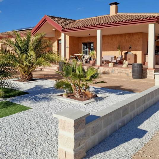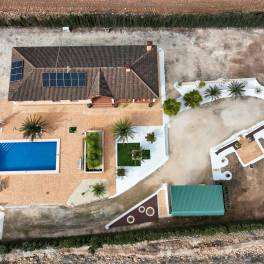 Prachtige instapklare villa, rustig gelegen nabij Pinoso met vier slaapkamers en ruim overdekt terras dat uitkijkt op de fraaie tuin met zwembad en het weidse omliggende landschap.Het terreinZodra je de elektrisch bedienbare poort door bent gereden en je de auto hebt geparkeerd onder de dubbele carport, hoef je alleen nog maar te genieten van de aanblik van de luxe villa, de tuin in Mediterrane sfeer, die deels is omheind. Het andere deel is voorzien van vele amandelbomen. Natuurlijk mag een ruim zwembad niet ontbreken en er is bovendien een pool house en buitendouche bij het zwembad gelegen. Rondom het zwembad is een zeer ruim terras aangelegd waar het heerlijk relaxen is onder de Spaanse zon. Iets meer schaduw nodig? Dan biedt het ruime overdekte terras van de villa die mogelijkheid. Daar is bovendien een deel ingericht als BBQ/buitenkeuken dus een ideale plek voor een paella of tapas met een heerlijke lokale wijn.De villaDe villa heeft een inkomsthal met inbouwkast. De royale woonkamer biedt via dubbele deuren toegang tot het terras en heeft een zit- en eetgedeelte. Aangrenzend, gescheiden door een ontbijtbar, ligt de ruime keuken. Er is een aparte ruimte voor de opstelling van de wasmachine/droger en boiler. Deze ruimte biedt bovendien veel bergruimte.Verder biedt deze villa drie slaapkamers en een aparte badkamer en er is bovendien een royale hoofdslaapkamer met inbouwkasten en badkamer ensuite.VoorzieningenDe villa is aangesloten op elektriciteit en water. Er zijn zonnepanelen met batterijen aanwezig die zorgen voor minimale maandelijkse elektriciteitskosten. Er is een warmtepomp aanwezig voor de vloerverwarming. In de woonkamer is er airconditioning voor zowel verwarmen als koelen.PinosoIn Pinoso zijn alle dagelijkse voorzieningen beschikbaar, waaronder supermarkten, scholen, een medisch centrum en sportfaciliteiten, evenals een uitgebreid aanbod aan restaurants. Pinoso kent vele wandel-, hiking- en fietsroutes en is omringd door amandel-, olijf- en wijngaarden. De sfeer is gemoedelijk en Pinoso biedt een mooie balans tussen de traditionele Spaanse cultuur, de mooie natuur en moderne voorzieningen – dat alles in een heerlijk mediterraan klimaat. Zowel de luchthavens van Alicante en Murcia als de stranden zijn binnen een uur te bereiken. Neem vandaag nog contact met ons op voor een bezichtiging!Deze woning is exclusief in de verkoop, dit betekent dat alle documenten vooraf zijn gecontroleerd en alles in orde is of in orde gebracht kan worden.