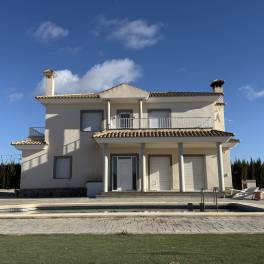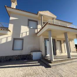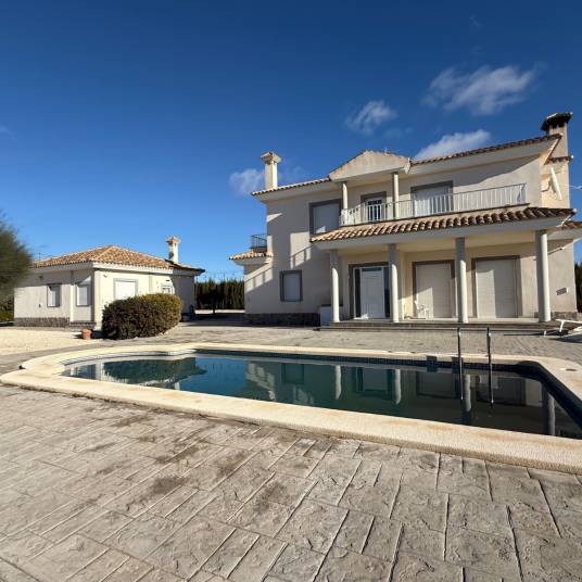 Deze ruime villa ligt op een rustige locatie net buiten Pinoso, en biedt zowel privacy als comfort dankzij twee aparte woningen op één groot perceel van ruim 8.000 m². De hoofdwoning is licht, verzorgd en praktisch ingedeeld, met meerdere slaapkamers en een fijne verbinding naar buiten. Daarnaast beschikt het terrein over een volledig zelfstandige gastenwoning.De hoofdvilla bestaat uit een royale woon-/eetkamer met veel natuurlijk licht, een aparte keuken met bijkeuken, een ruime slaapkamer op de begane grond en een badkamer. Op de eerste verdieping bevinden zich nog drie slaapkamers, twee badkamers en een terras met uitzicht op het perceel.De gastenwoning (62 m²) staat los van het hoofdgebouw en beschikt over een eigen woonkamer, keuken, twee slaapkamers en een badkamer. Voor de villa ligt een zwembad van 38 m². Het perceel is volledig omheind met een metalen hekwerk en een groene haag die veel privacy biedt. De toegangspoort is elektrisch. De woning is uitgerust met onder andere centrale luchtverwarming, airconditioning, alarm met camerabewaking, drinkwateraansluiting en elektriciteit. Kortom: een instapklare villa met uitstekende voorzieningen op een geliefde landelijke locatie.