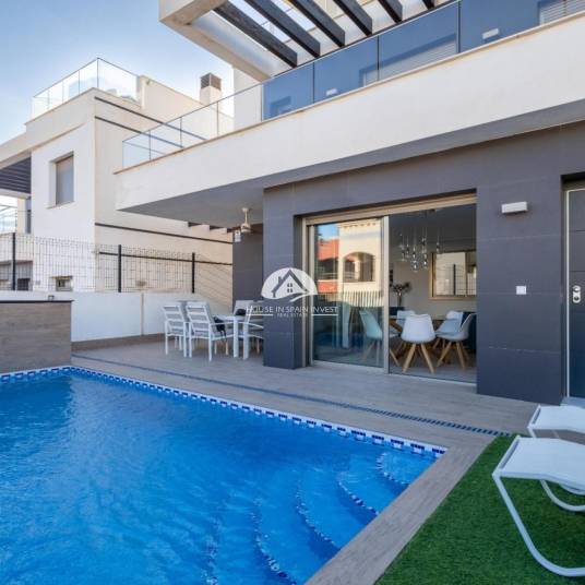 Exclusieve Villa met Privézwembad in Orihuela Costa. Beleef de mediterrane levensstijl in deze villa van 119 m2, perfect gelegen in het hart van Orihuela Costa, nabij de kust van Alicante.. . Indeling: 4 ruime slaapkamers en 3 complete badkamers.. . Exterieur: Perceel van 180 m2 met privétuin, terras en eigen zwembad.. . Comfort: Volledig gemeubileerd met airconditioning (warm/koud).. . Extra’s: Berging en geïnstalleerd alarmsysteem.. . Ideaal als permanente woning of vakantie-investering. Neem contact met ons op voor een bezichtiging!