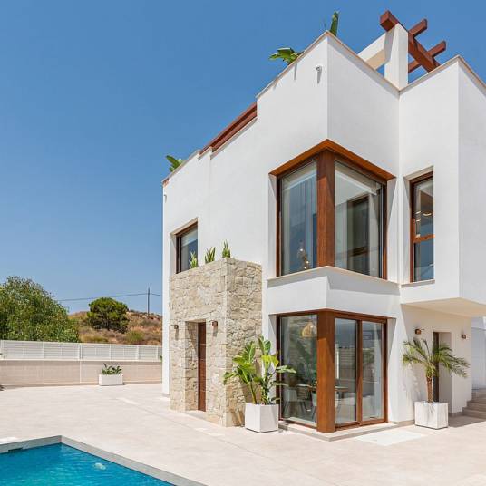 Modelo Estrella bestaat uit twee of drie slaapkamers met twee badkamers, allemaal op één verdieping. Er is een ruime open woon-/eetkamer, die leidt naar de privétuin met eethoek buiten en zwembad, Er is een ruime open woon-/eetkamer, die leidt naar de privétuin met privézwembad. Het solarium op het dak is toegankelijk vanuit de tuin.