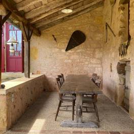 Monumentale schuur in Périgord-stijl (ca. 90 m² vloeroppervlak) en een tweede open schuur, die momenteel in gebruik is als overdekte ontvangst- of recreatieruimte.