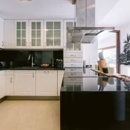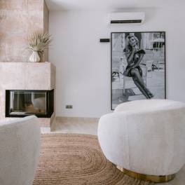 Het interieur is afgewerkt in lichte kleuren en hout, wat een serene, moderne en mediterrane sfeer creëert. Op de begane grond vindt u een ruime open woonkamer met een volledig uitgeruste keuken. De woonkamer, met open haard, komt uit op het buitenterras waar u eindeloos kunt genieten van het uitzicht op de tuin en het prachtige zwembad. De hoge plafonds en grote ramen zorgen voor veel natuurlijk licht en verbinding met de omringende natuur.