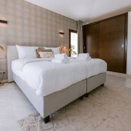 De begane grond biedt 2 slaapkamers, waaronder een master suite met een en-suite badkamer. Daarnaast biedt deze verdieping een tweede kamer die kan dienen als kantoor of extra slaapkamer, ook met een en-suite badkamer. De bovenverdieping herbergt 2 master suites, beide met luxe en-suite badkamers, en 2 extra slaapkamers die een badkamer delen.