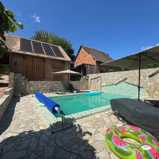 Ruime boerderij met gastenverblijf! In een mooie heuvelachtige en met veel natuur omgeven omgeving ligt het dorp Almamellék waar men nog enkele basisvoorzieningen voorhanden heeft zoals een buurtwinkel en een café. Door de centrale ligging tussen Kaposvár ( 45 minuten en 30 km ) en Szigetvár ( 20 minuten en 15 km ) en Pécs ( 1 uur en 50 km ) zijn er ruimschoots mogelijkheden om te shoppen. De omgeving kenmerkt zich door de vele heuvels, water en bossen. Er zijn veel fiets en wandelroutes. De bereikbaarheid van en naar Almamellék is goed. Het gaat hier toch wel om een unieke kans om wat moois en instapklaar te kunnen kopen met prachtig panoramisch uitzicht over de velden en het water.Het gaat hier om een toch wel speciaal object…….gelegen in een populair dorp en op een ruim perceel en bestaande uit een hoofdboerderij, gastenverblijf en een grote schuur. En dat alles in een goede en direct bewoonbare staat! De hoofdboerderij is ongeveer 235 m2 en heeft een hal, ruime woonkamer, leefkeuken, ruime slaapkamer, badkamer met bad en inloopdouche en een separaat toilet. Via een vaste trap komt men op een vide met mooi zicht op de woonkamer en via een hobbyruimte komt men in een ruime leefzolder met slaapruimte en een eigen badkamer met toilet. Het onderste deel is voorzien van vloerverwarming en de mooie grote tegelkachel zorgt voor veel gezellige warmte. De keuken is voorzien van al het moderne comfort. De meeste ruimtes zijn voorzien van airco’s die zorgen voor de koelte in de warme zomerdagen.Aan de andere zijde van het brede perceel ligt het gastenverblijf met een eigen ingang, Het woonoppervlak is ongeveer 48 m2 en er is een woonkamer met open keuken, slaapkamer, badkamer met toilet en een extra opslagruimte. Via betegelde paden komt men bij het overdekte terras ( ongeveer 32 m2 ) met een gezellig zit, eet en kookdeel. De goed uitgeruste buitenkeuken en de pizzaoven zorgen voor heerlijk eten en gezelligheid. Het verlichte zwembad ( verwarmd en gekoeld ) met een eigen zuiveringsinstallatie zorgt voor de kers op de taart. De klusser is ook niet vergeten want de mega schuur van ongeveer 140 m2 met hoge doorloop deuren naar het achterste deel van het ruime en geheel omheinde perceel is voorzien van al het gemak voor de klusser. Betonnen vloer, een draaideur waardoor men de draai met de auto kan maken om hieraan te werken is wel speciaal en zeer handig. Uiteraard is hier ook krachtstroom aanwezig. Alles staat op een ruim en breed perceel van 4261 m2 en zeer geschikt voor het houden van kleinvee…….helemaal achter op het perceel staat zelfs een stal waar men kan schuilen.Elektra ( 3×32 Amp.plus krachtstroom) en water is aanwezig en de afwatering loopt via een septic tank. Als verwarming zijn er airco’s, CV op gas en een hout en tegelkachel. Er is een eigen gastank aanwezig en een waterontharder voor het ontkalken van het water. Internet en tv aansluiting is mogelijk.Als men echt zorgeloos wil wonen en vanaf dag 1 alleen maar genieten van het mooie Hongarije….dan is dit de kans! Prijs: € 235.000,- Kosten Koper. Almamellék is een plaats (község) en gemeente in het Hongaarse comitaat Baranya. Almamellék telt 399 inwoners (2024). Het is een langgerekt groen streekdorp, 15 kilometer ten noorden van het historische stadje Szigetvár. Het dorp ligt in een bosrijk dal van het Mecsekgebergte.