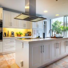 Het hart van het huis is de royale eetkeuken, uitgerust met hoogwaardige Miele-apparatuur, waaronder een inductiekookplaat. Deze keuken komt direct uit op het zonnige terras, waar een ingebouwde grill het buiten koken gemakkelijk en plezierig maakt. Vlakbij bevindt zich de complete wasruimte, die zowel praktisch als elegant is, met op maat gemaakte opbergkasten, een opklapbare tafel en een Miele-wasmachine en -droger.
