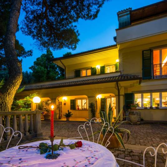 Op een paar kilometer afstand van het centrum van Fano, ligt deze prestigieuze villa , het uitzicht op zee is uniek en spectaculair, de villa is omgeven door een park van 3,6 hec. met oude bomen